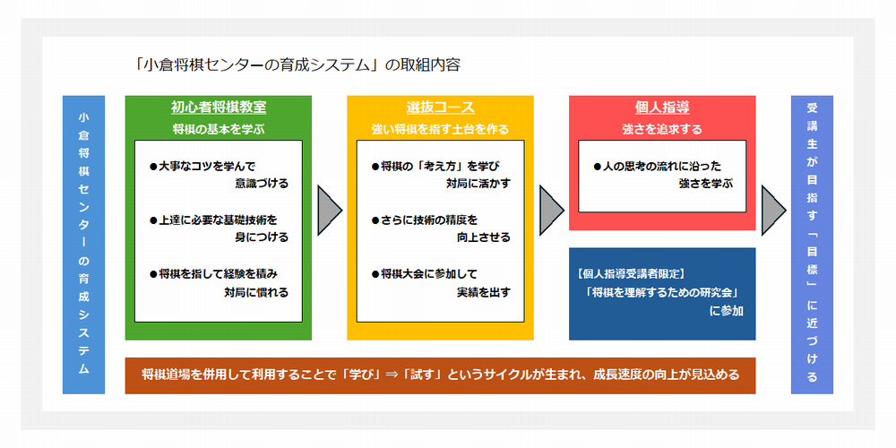 小倉将棋センターの将棋教室は個別に受講しても十分な効果を見込めますが、当センターの「初心者将棋教室」から「個人指導」まで一貫性のある指導を継続して受講することで、将棋に対する理解が深まりさらに高い効果を狙えます。また、教室で学んだことを試し経験を積む場として、教室会員は割引価格で将棋道場を利用できます。