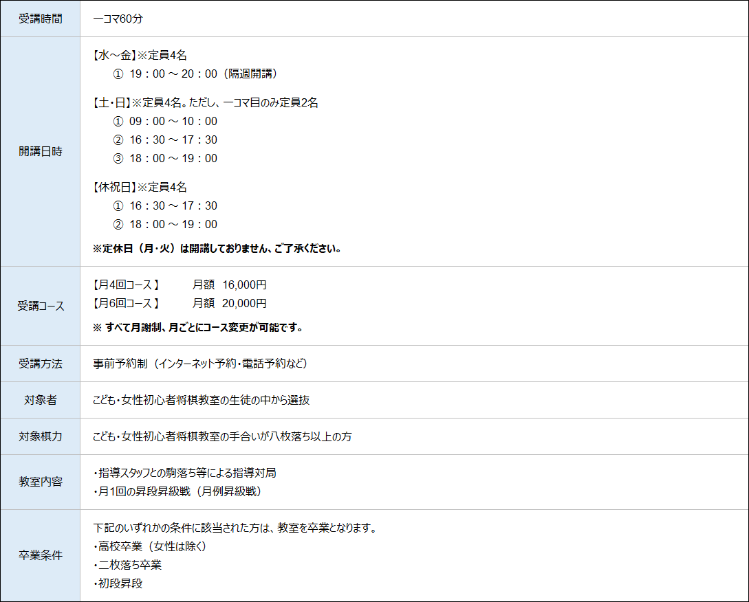 受講回数を月4回と6回から選択でき、対局数を確保するため道場の月極(フリー利用)がセットになっているのが特徴です。