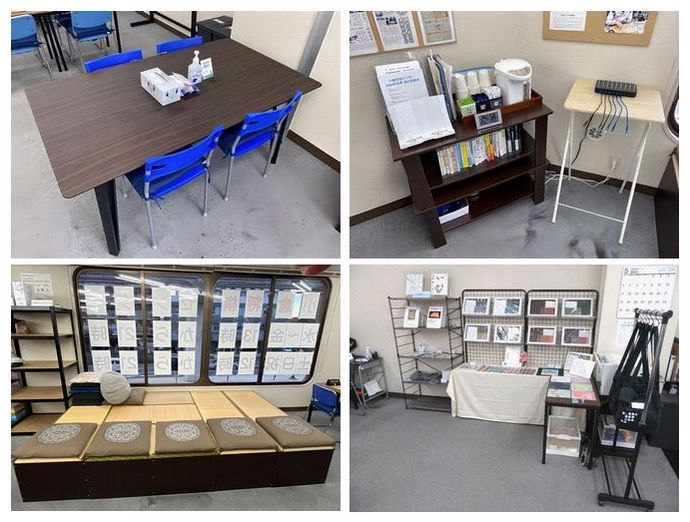 飲食のできる歓談席、飲み物のフリーコーナーや携帯電話の充電器等、ご自由にご利用いただけます。また、付き添いの方がゆったりとお待ちいただけるユニット畳や将棋グッズのご購入をお楽しみいただける物販コーナーもございます。